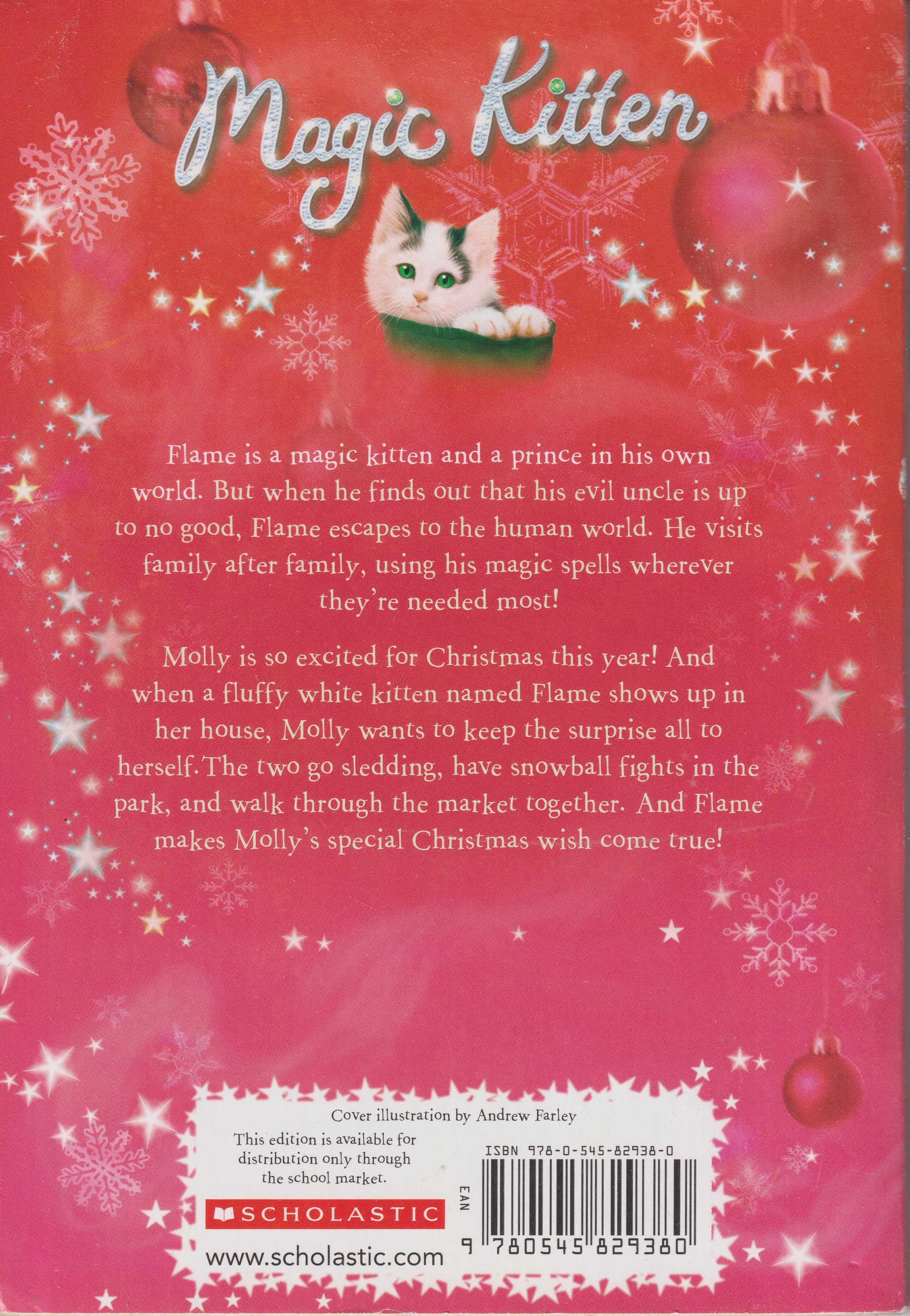 2014 Scholastic Paperback Edition of Magic Kitten a Christmas Surprise by Sue Bentley illustrated by Angela Swan. 120 pages with some illustrations, Juvenile Fiction, Ages 6-9 A White Christmas Kitten needs a friend! Flame is a magic kitten and a prince in his own world. But when he finds out that his evil uncle is up to no good, Flame escapes to the human world. He visits family after family, using his magic spells wherever they are needed the most! Molly is so excited for Christmas this year! And when a fluffy white kitten named Flame shows up in her house, Molly wants to keep the surprise all to herself. The two go sledding, have snowball fights in the park, and walks through the market together. And Flame makes Molly’s special Christmas wish come true!