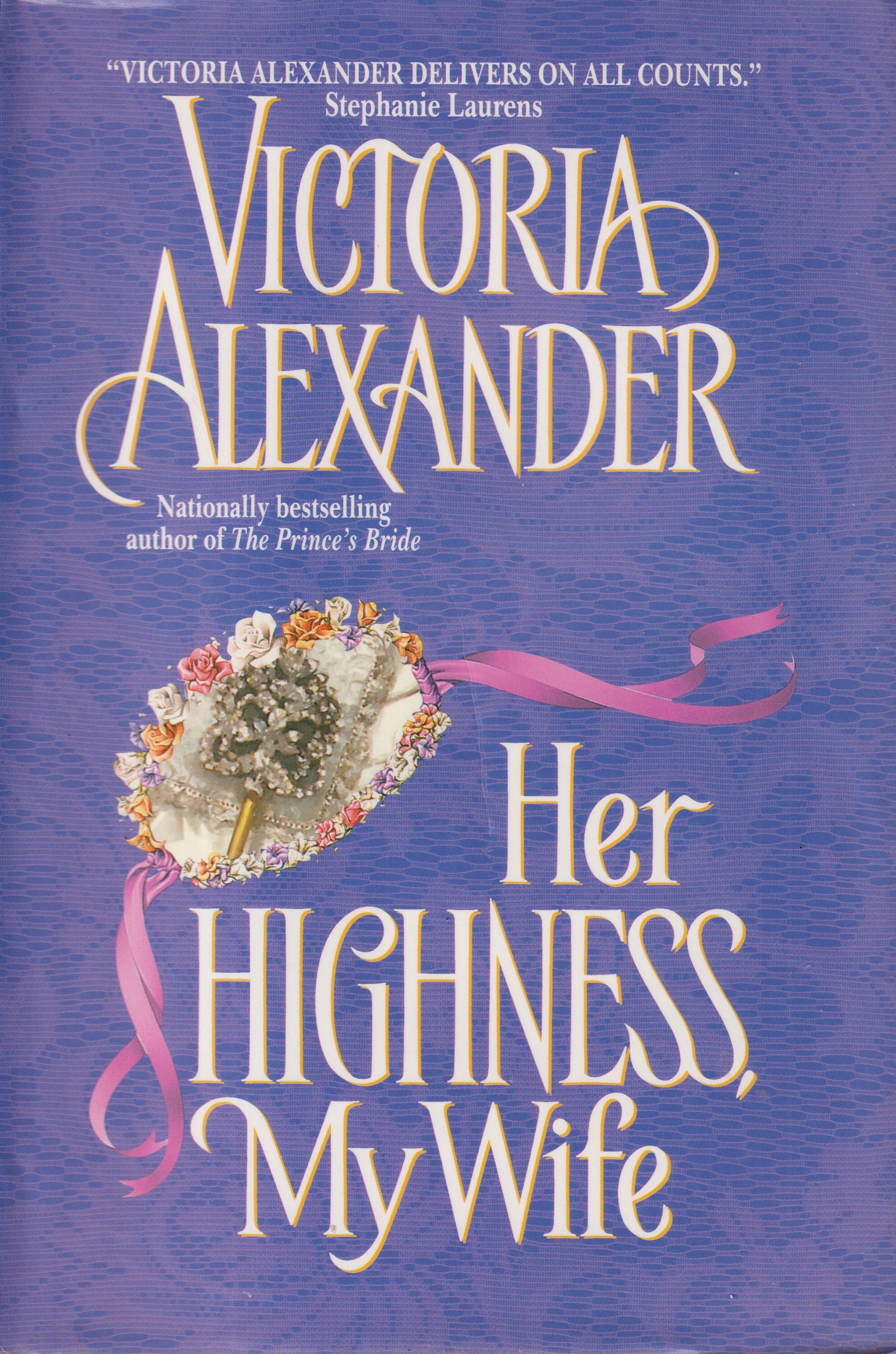 2002 Avon Hardcover Book Club edition of Her Highness, My Wife by Victoria Alexander 362 pages. From the dustjacket; Even a princess must obey her heart....Countless suitors sought her crown, but he alone wanted her heart. Though women never refused handsome Lord Matthew Weston’s attentions, the tempting Tatiana was the first to impetuously say, “I do.” Yet the morning after their wedding, Matthew awoke to find her gone – with only a bitter truth to share his bed. The enchanting maid he married was a princess only posing as a commoner to escape the tedium of royal life. She abandoned Matthew without a second through and he would not forgive her..not even when she returned to humbly request the kind of help only he could provide. He would help her – all the while guarding his heart, certain there were other secrets the royal beauty concealed. Still, he wondered what it would take to turn a proud princess into a passionate bride.