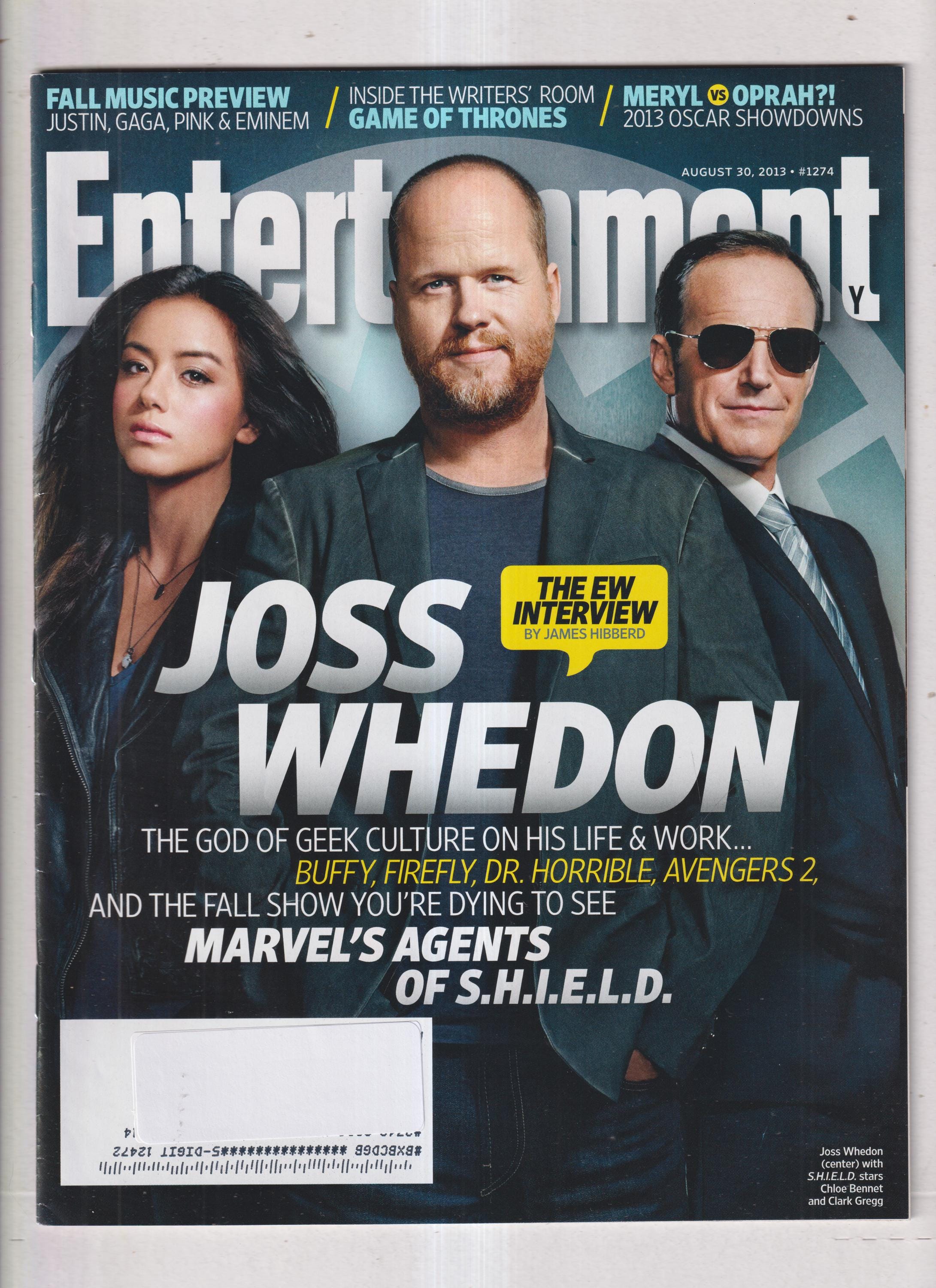Single issue magazine that focused on pop culture, including movies, television, music, books, and other aspects of entertainment. It offered not only news and reviews but also insightful commentary, features, and interviews with industry stars. Known for its iconic cover stories, the magazine was a go-to for fans seeking both in-depth information and fun, bite-sized updates about their favorite shows, artists, or upcoming blockbusters. This issue features: Entertainment Weekly August 30, 2013 Joss Whedon The EW Interview, Fall Music Preview -Justin, Gaga, Pink Eminem, In the Writer's Room for Game of Thrones, Meryl vs Oprah? Oscar Showdown, and more.