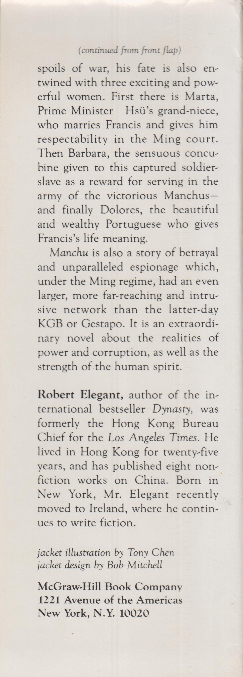 2005 Hardcover edition of Manchu by Robert Elegant 560 pages. From dustjacket: In Manchu, the best-selling author of Dynasty takes the reader on an epic journey into the rich and exotic past of China in the seventeenth century. The time is not long after the Jesuits made their first successful missionary venture into China by converting to Catholicism many of the mighty - including the Empress Dowager and the powerful Prime Minister, Paul Hsu. A master storyteller, Robert Elegant combines historical truth and vivid imagination to re-create the intrigue, decadence, and corruption that led to the demise of the Ming Dynasty and the rise of the conquering Manchus.
